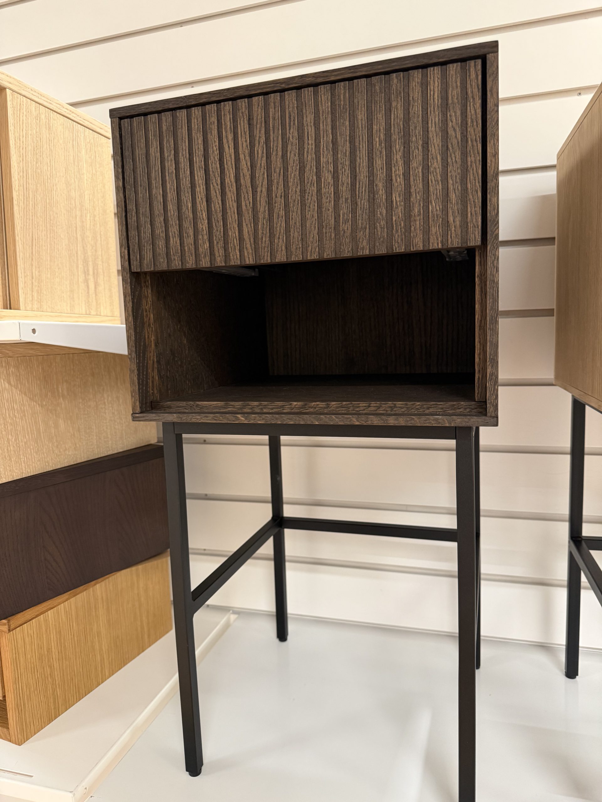 Elma sängbord är ett nätt och stilfullt sängbord med underrede i svart metall och topp i mörk ek.